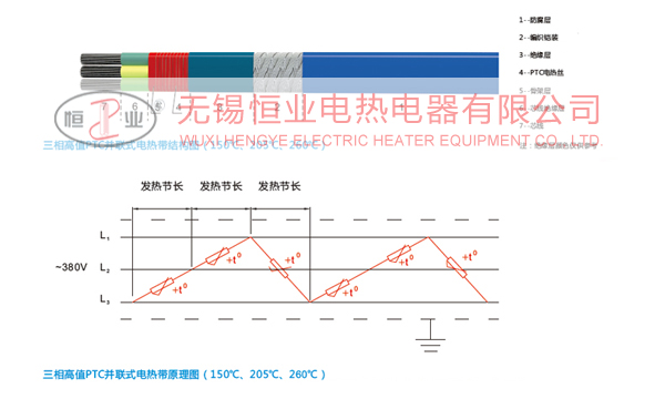 被伴熱體表面各處溫度,連續使用將導致在保溫層與被伴熱體之間的電伴熱器材在某些散熱不良的部位超溫燒壞。具有PTC特性的電伴熱器材,其發熱元件當溫度上升時,其自身阻值也隨之增加(發熱功率自動減小);當溫度下降時自身阻值隨之下降(發熱功率自動增加),它安裝在保溫層與被伴熱體之間工作,能動態跟蹤被伴熱體表面溫度,沿長度自動調節各處功率,使被伴熱體表面恒溫,且防止某些散熱不良的部位超溫引起燒壞。且有PTC特性的材料,既是電致熱元件,又是溫度測量元件和功率調整元件。