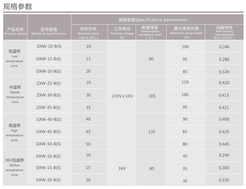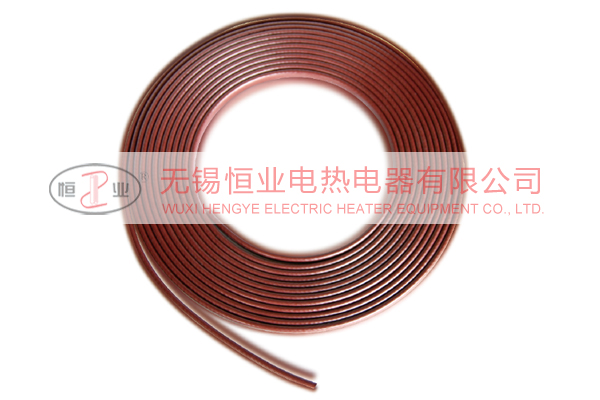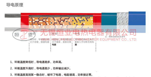 “自限溫電熱帶"主要由導電復合材料(半晶態聚合物和導電碳黑)經擠出工藝成型為扁平電熱帶, 經化學或物理鉸鏈處理呈帶狀。由于極明顯的正溫度電阻系數(PTC)的效應產生其功率隨溫度變化而變化的結果,環境溫度降低時功率輸出隨之增加;環境溫度升高時功率輸出隨之減少;在設計的穩定溫度自動產生目標溫度敷設在管道上伴熱,不論管道季節晝夜局部的溫度復雜變化,都能使管道恒溫,可不需另設溫控器。它是利用PTC調功功能來實現的,與前面我公司生產的“高值PTC并聯帶”一樣。發熱元件既是電致熱元件又是測溫元件,也是調功執行元件。